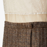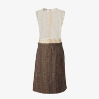 Trompe-l’oeil effect midi dress with round neckline and wrap skirt. Side pockets and back closure. Lined in silk. Made of a brown wool tweed skirt and a cream lace top. Finished with trimming details and tone-on-tone lace jabot motif on the front. Made in Italy Composition: 43% wool, 40% alpaca, 17% polyamide, 51% viscose, 49% polyamide, 100% polyamide, lining: 100% silk Size worn: 38 IT. The model is 180 cm tall Product Code: FDD425AVJAF1M2A