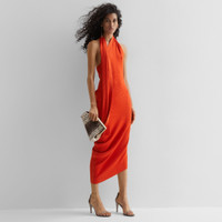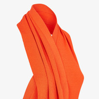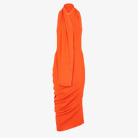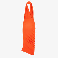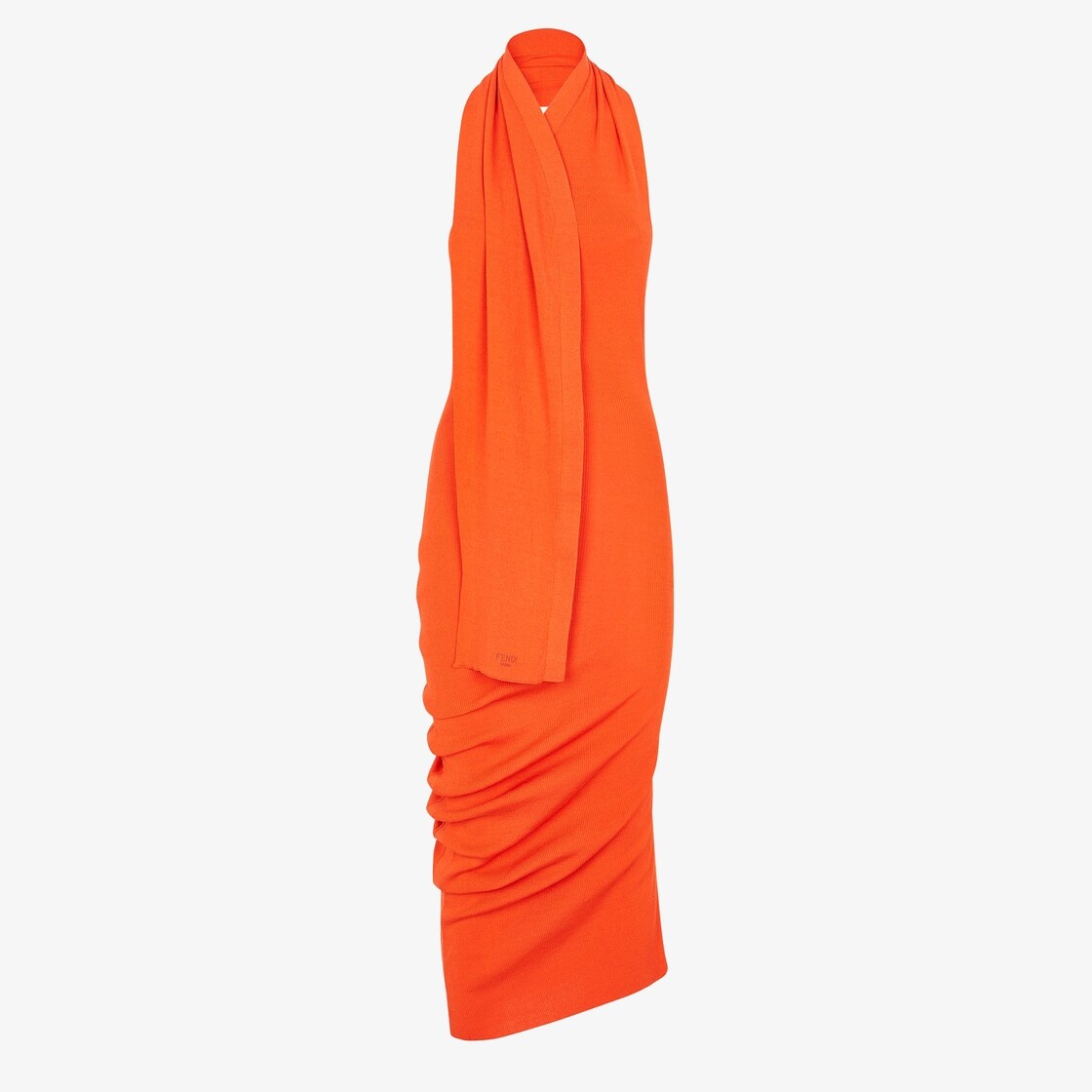 Fitted sleeveless dress. Halter neck and bare back, small V neck and foulard cross-over detail with matching Fendi Roma lettering embroidered at the hem. Asymmetric draped motif on the hem. Made of a lightweight, soft orange cotton and silk rib knit. Made in Italy Composition: 57% cotton, 43% silk Size worn: 38 IT. The model is 175 cm tall Product Code: FZDC27ARV4F0QG5