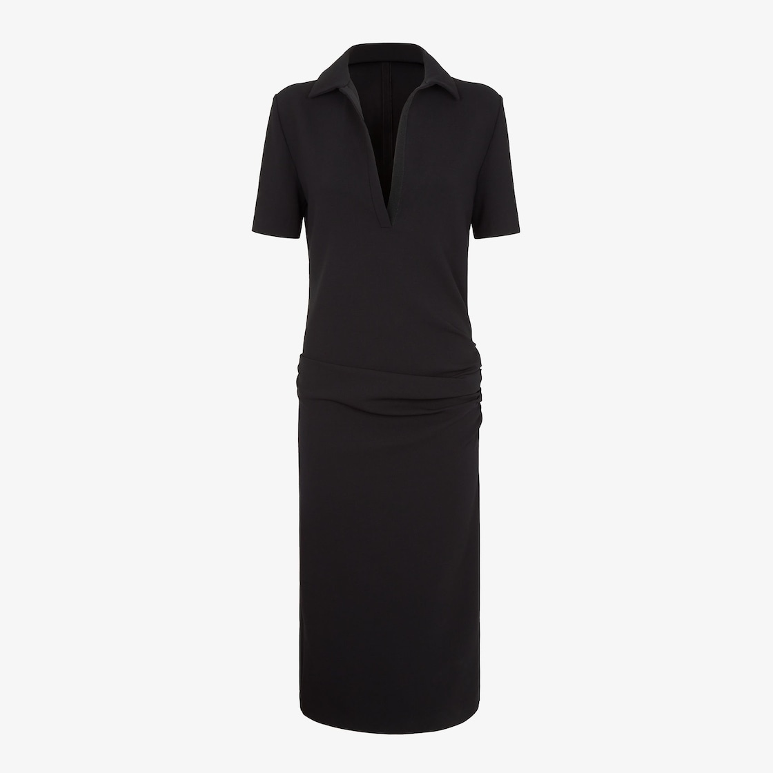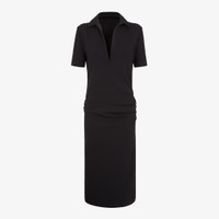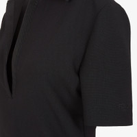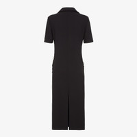 Midi dress with draping at the front waist. Open, polo-shirt-style collar and short sleeves. Center slit at the back. Made of black wool cady. Embellished with black satin trim on the neckline and matching Fendi Roma logo embroidered on the left sleeve. Made in Italy Composition: 96% fleece wool, 4% elastane, 100% silk Fit: Regular Size worn: 38 IT. The model is 177 cm tall Product Code: FDD290ATNEF0GME
