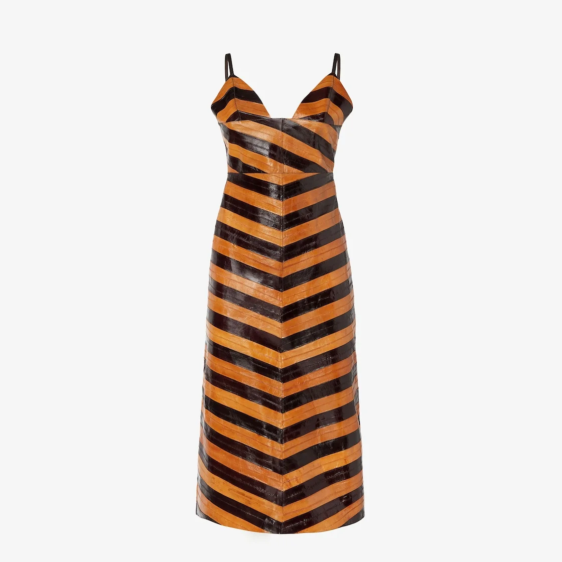 Sleeveless midi dress with wide neckline and thin shoulder straps. Waistline seam and flared skirt. Unlined. Made of hagfish leather with an inlaid Chevron motif in dark brown and caramel, inspired by an archive Fendi design. Made in Italy Composition: 100% myxine leather Size worn: 38 IT. The model is 180 cm tall Product Code: FPB659AVJ7F1TJK