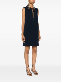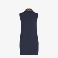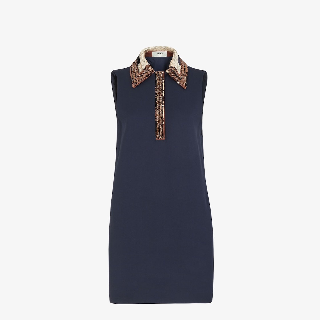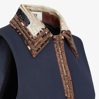 Short sleeveless dress. Side inset pockets, polo-shirt style collar and concealed button fastening. Made of navy blue wool and silk cady. The collar is embellished with color-block effect sequin embroidery in different contrasting shades. Made in Italy Composition: 65% silk, 35% wool, lining fabric: 100% cupro, decoration; 100% glass, 5 buttons: mother of pearl Size worn: 38 IT. The model is 177 cm tall Product Code: FDD145ARUAF0QB0