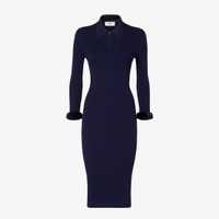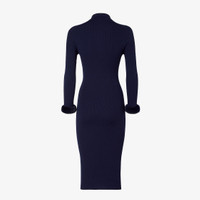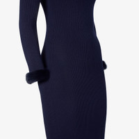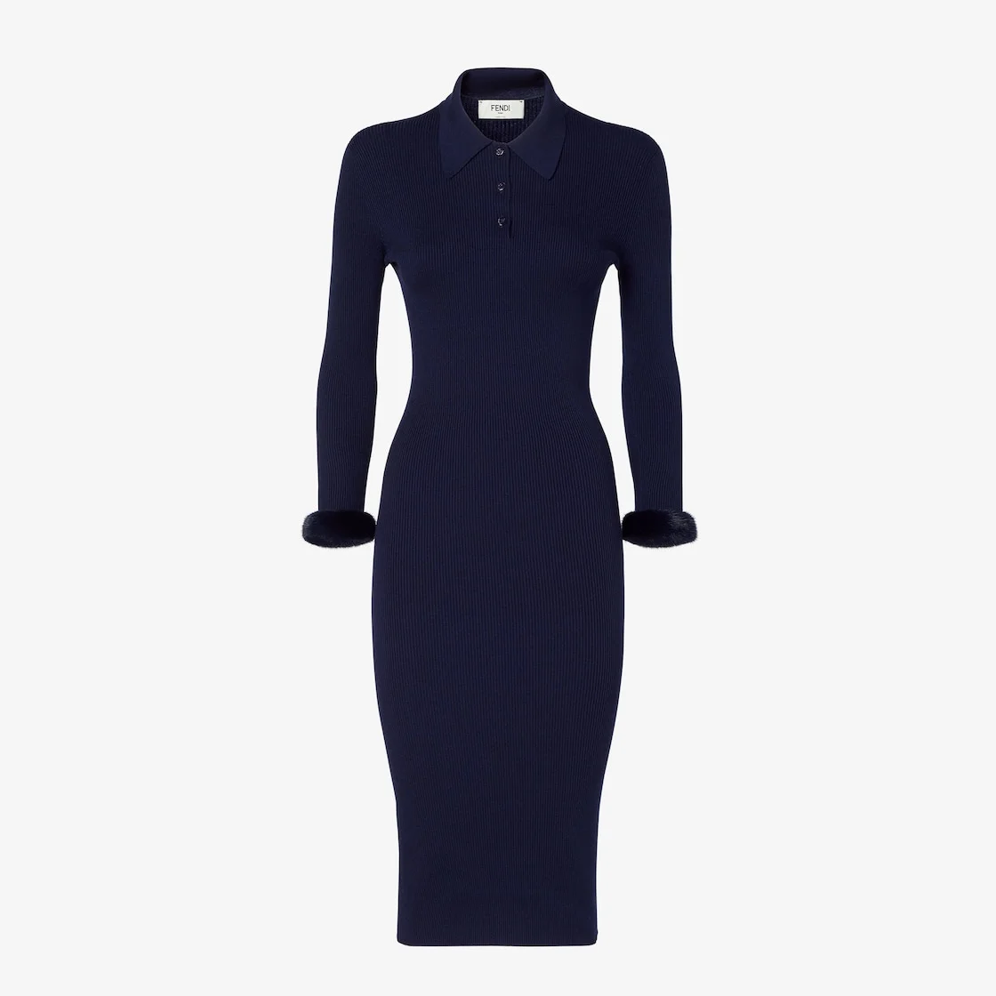 Midi dress with polo collar and long sleeves. Fitted. Made of dark blue wool and silk yarn in a rib knit. Embellished with detachable mink cuffs in the same color. Made in Italy Composition: 70% wool, 30% silk, 4 buttons: mother of pearl Product Code: FZDE02AW4AF1UKI