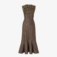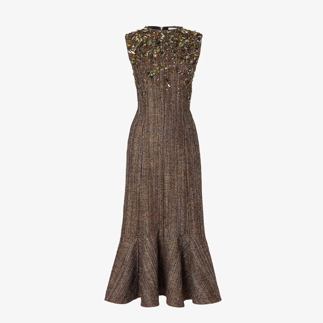 Sleeveless midi dress with peplum detail at the hem. Close-fitting with crew neck and zipper closure on the back. Lined in silk. Made of rust-colored wool and alpaca tweed melange, embellished with hand-crafted embroidery: crystals of different shapes and sizes create depth and movement, while fabric shapes decorated with crystals appear to emerge from the surface, fading into a gradient effect. Made in Italy Composition: 43% wool, 40% alpaca, 17% polyamide, lining: 100% silk Size worn: 38 IT. The model is 178 cm tall Product Code: FDD435AYN5F1T6K