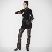 Close-fitting short dress. Long-sleeved and with hood collar. Made of soft wool and silk ribbed jersey in black. Embellished with a contrasting embroidered Fendi Roma logo on the left-side sleeve. Made in Italy Composition: 70% wool, 30% silk Size worn: 38 IT. The model is 178 cm tall Product Code: FZDC60ASJKF0GME