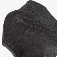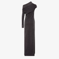 Long one-shoulder dress with fitted waist. Long sleeve and draped neckline. Deep side slits at the hem. Made in a black knit with metallic yarn. Viscose lining. Embellished with ribbed detail on the collar and cuffs and lacquered metal Fendi nameplate on the left sleeve. Made in Italy Composition: 100% viscose Fit: Slim Size worn: 38 IT. The model is 177 cm tall Product Code: FZDD06ATPGF0P9B