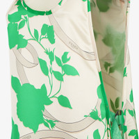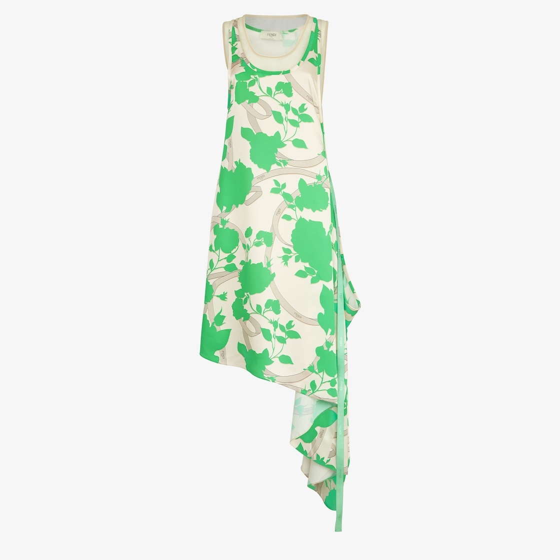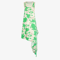 Flowing sleeveless midi dress featuring an asymmetric hem and godet motif on the side. Side closure with logo ribbon and metal rings. Made of beige silk with the Fendi Roses motif printed all over in neon green. Tech fabric underdress with multi-layer effect visible details. Made in Italy Composition: 100% silk, underdress: 88% polyamide, 12% elastane Model height: 180 cm Size worn: 38 IT Product Code: FDC578ANQUF1KY5
