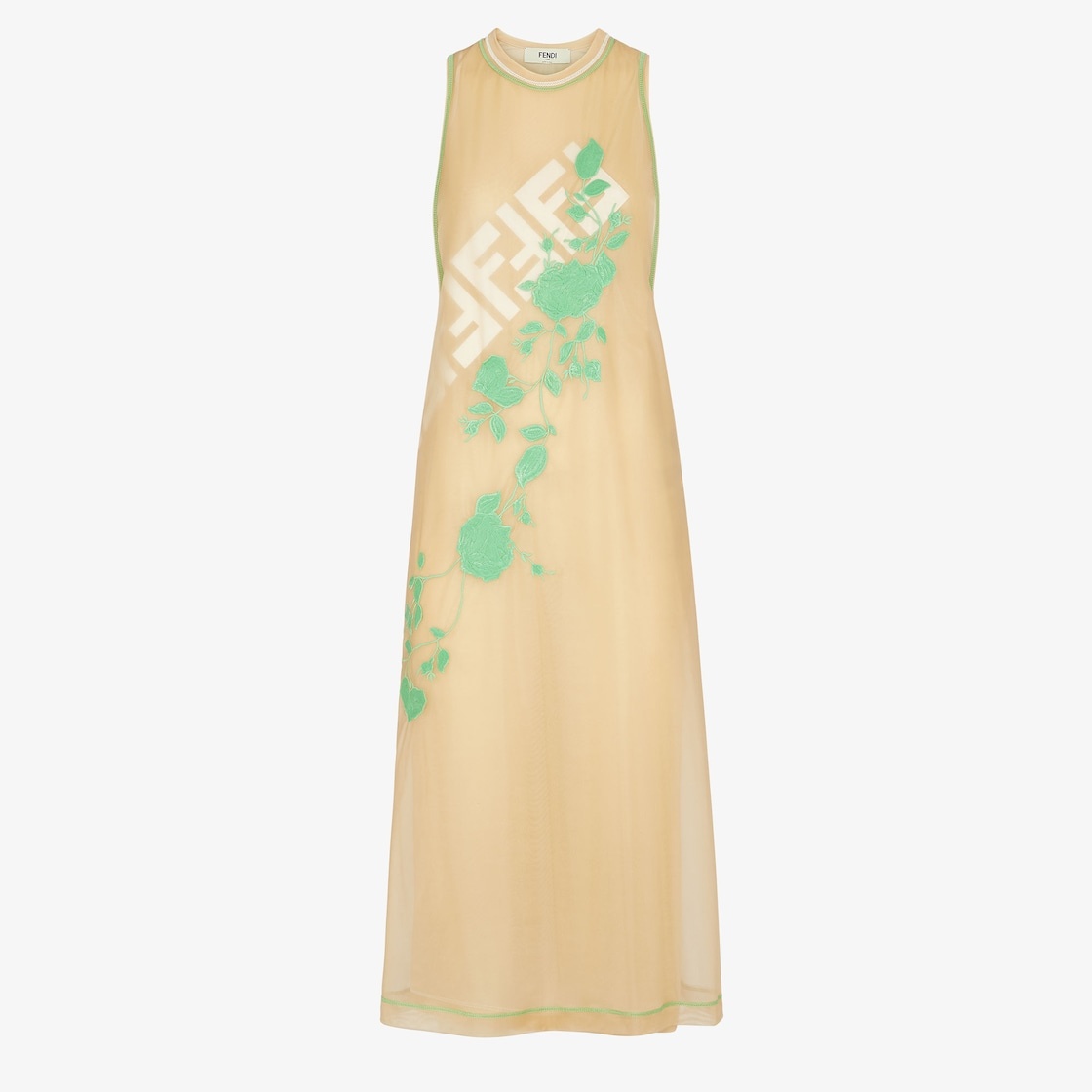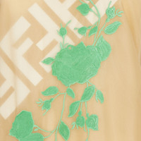 Sleeveless pinafore-style dress fastened behind with a snap and long logo ribbons. Made of semi-sheer beige technical jersey. Decorated with the Fendi Roses motif hand-painted in white and sporty contrasting topstitching. Matching, multi-layer effect midi underdress in neon green with a halter neck and tonal FF motif. Made in Italy Composition: 100% polyamide, embroidery coating: 100% polyurethane, underskirt/underdress: 88% polyamide, 12% elastane, buttons: 100% mother of pearl Model height: 176 cm Size worn: 38 IT Product Code: FDC602ANQ3F1KTM