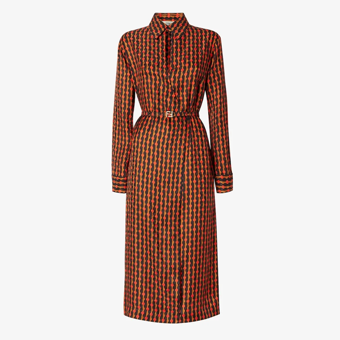Midi shirt dress with shirt collar and cuffs. Flowing style with dropped shoulder and teardrop detail on the neckline. Asymmetrical cross fastening with small button on the side. Made of jacquard silk with a geometric red and black Fendi Macro Dots motif inspired by the iconic Fendi Fall/Winter 2000 fashion show. Matching belt with FF buckle. Made in Italy Composition: 100% silk Size worn: 38 IT. The model is 178 cm tall Product Code: FDD443AVJ6F1TRL
