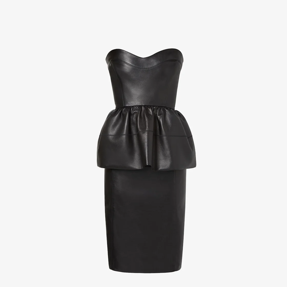 Short bustier dress with sweetheart neckline and peplum at the waist. Back zipper closure. Inspired by a dress actually worn by Silvia Venturini Fendi in the 1980s, it is made of soft black nappa leather. Finished with leather-style stitching and seams. Made in Italy Composition: 100% lambskin, lining: 100% viscose Product Code: FPB661AW7AF0GME