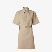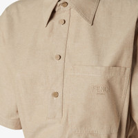 Gently flared short dress. Shirt collar and short sleeves. Side pockets and patch pocket on the chest. Matching belt. Polo-shirt closure with four buttons. Made of light brown denim chambray. Embellished with yarn-embroidered Fendi Roma lettering on the breast pocket. Made in Italy Composition: 100% cotton Size worn: 38 IT. The model is 178 cm tall Product Code: FLD560ASMCF1RX9