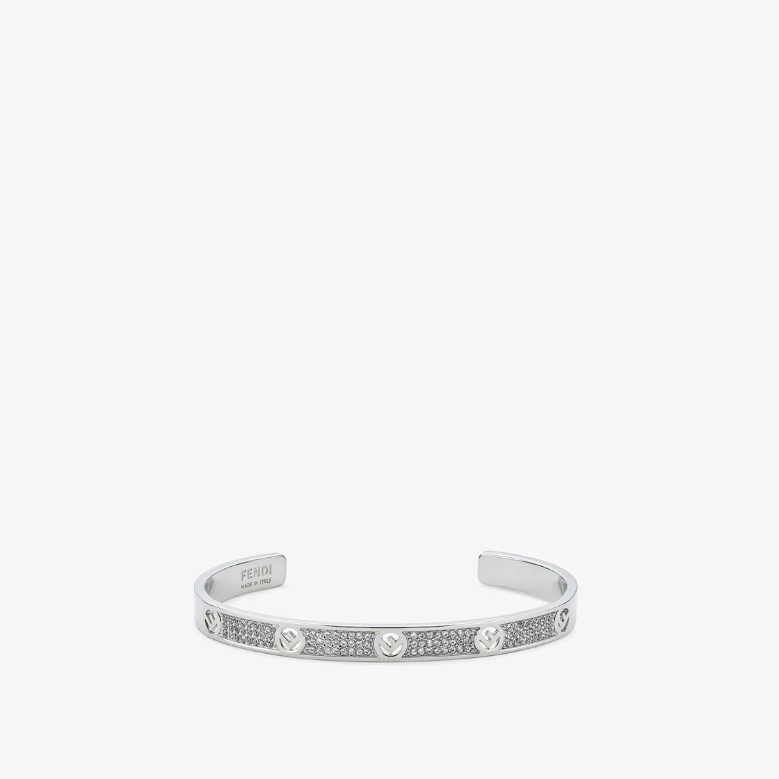 Rigid bracelet with ornamentation engraved in the shape of the F is Fendi logo. Made of palladium-finish metal. Decorated with natural crystals. Made in Italy Composition: 100% Brass, strass: 100% Crystal Product Code: 8AG9286GXF035M Product Care: The product you have purchased may be embellished with a precious metal top or varnish, and may also feature appliques, gemstones (in various shades of the same colour), crystals, plexiglass or resin. The mixture of materials and the unique features of the product are what give it its character. In order to best maintain the product’s appearance over time, we recommend avoiding contact with sea water, spa water, lacquers, perfumes, solvents, chemicals and abrasive materials. If necessary, clean with water and a neutral soap and/or polish with a dry microfibre cloth.
