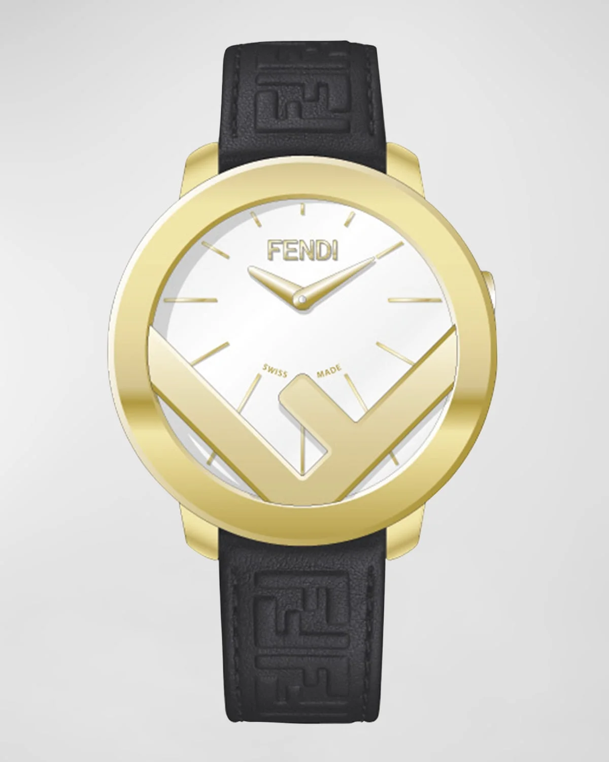 - Fendi "F is Fendi" leather bracelet watch in gold-tone stainless steel - 28mm; round gold-tone stainless steel case - Silver white dial - FF-logo at face - Logo lettering at 12 o'clock - Calf leather bracelet; FF-embossed pattern - Fold-over buckle closure - Made in Switzerland