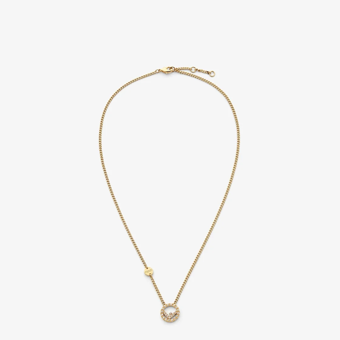 Fine chain necklace with round F is Fendi pendant. Adjustable clip closure. Made of a gold-finish metal and crystal details. Small customized tag on the front. Made in Italy Composition: 100% bronze, 100% glass Product Code: 8AL064ATEPF089U Product Care: The product you have purchased may be embellished with a precious metal top or varnish and may also feature appliques, gemstones (in various shades of the same color), crystals, plexiglass or resin. The mixture of materials and the special details give this product its unique character. To best maintain the product’s appearance over time, avoid contact with sea water, spa water, lacquers, perfumes, solvents, chemicals and abrasive materials. If necessary, clean with water and a neutral soap and/or polish with a dry microfiber cloth.