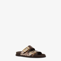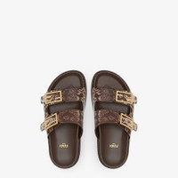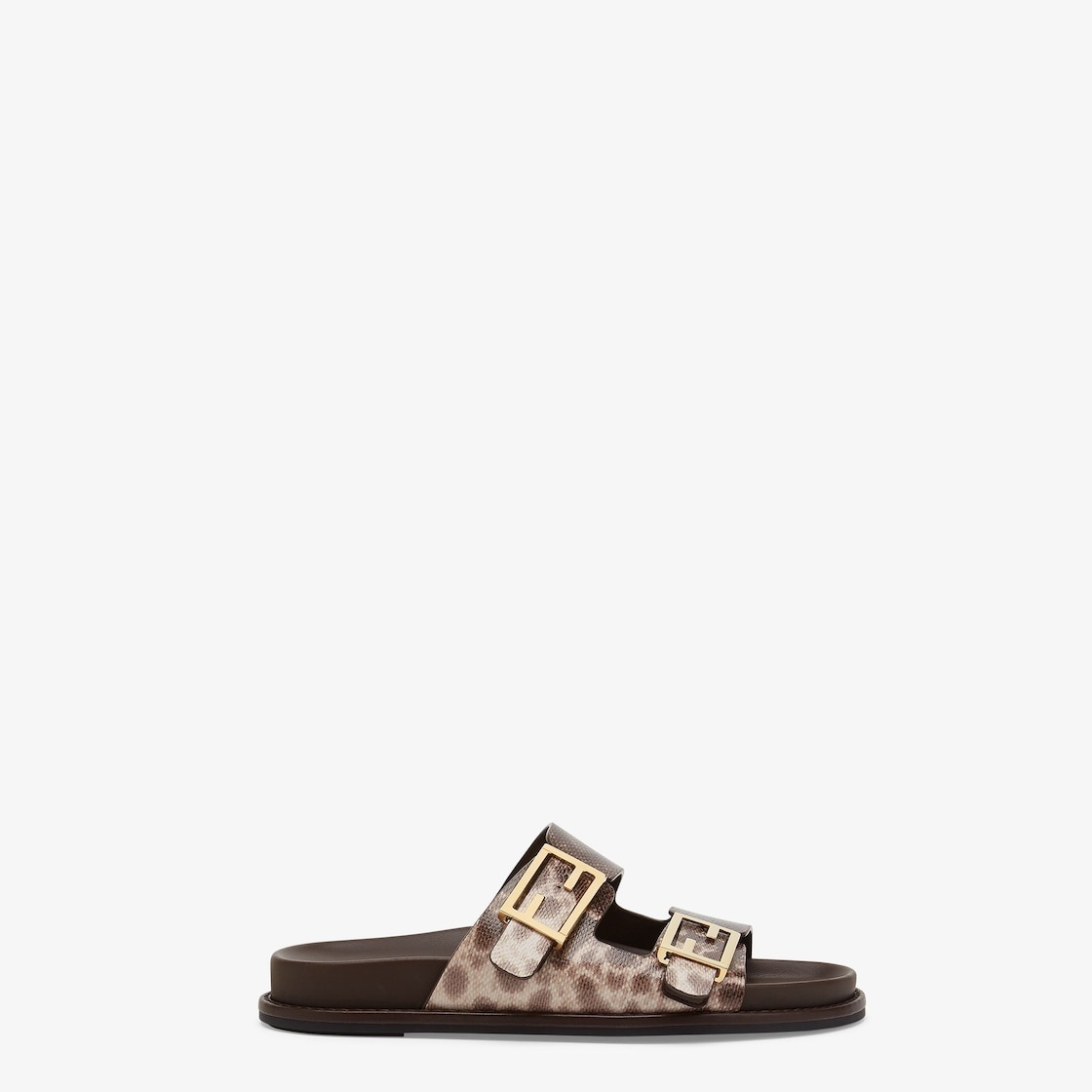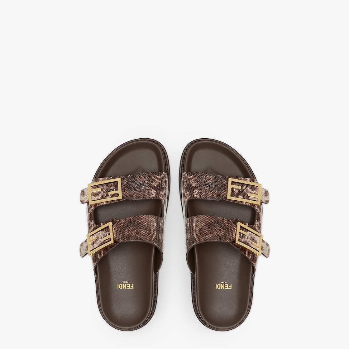 Double-band flat slides with FF Baguette decorative buckles. Made of beige karung leather. Gold-finish metalware. Made in Italy Measurements: - Heel height : 5 mm Composition: 100% karung snake leather, inside: 100% calf leather Product Code: 8X8326VMGF0QB9
