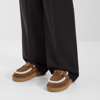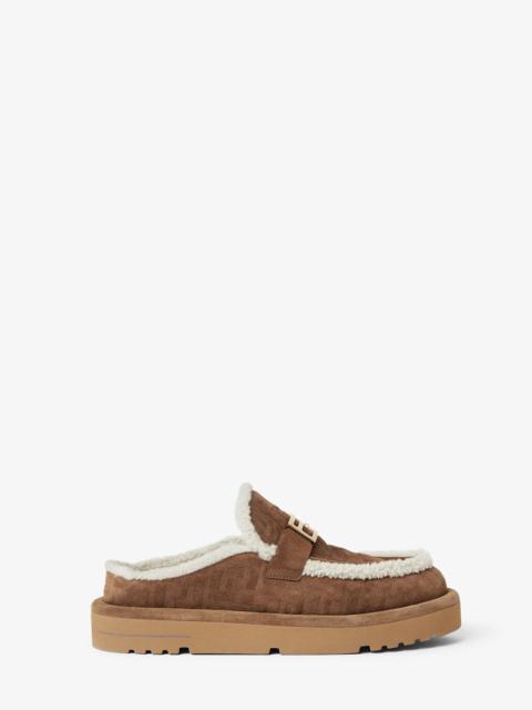 Round-toe apres-ski sabots. Crafted from brown suede with a tone-on-tone embossed FF motif. Inner lining and trim in white shearling. Embellished with gold-finish metal Baguette accessory. Chunky brown rubber sole with contrasting insert and Fendi lettering on the heel. Made in Italy Composition: 100% calf leather, inside: 100% sheep fur Product Code: 8R8777ASA1F0C23