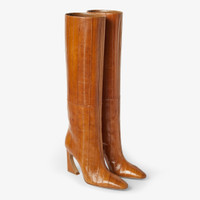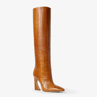 Tubular boots with tapered toe and high heel featuring the iconic Arco line, customized with metal detail and engraved logo. Made of shiny beige hagfish leather. Covered heel and leather sole. Made in Italy Composition: 100% hagfish, inside: 100% calf leather Product Code: 8W8802AOSHF0QB9