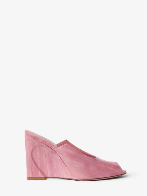 Wraparound peep-toe sandals with wedge heel featuring the iconic contoured Arco motif. Made of white ‘dorsato’ shearling, characterized by a trompe-l'œil effect that mimics the full, velvety texture of fox fur. Details and insole in tone-on-tone leather. Made in Italy Composition: 100% sheep fur, inside: 100% lamb leather Product Code: 8R8810AYFMF1TL5