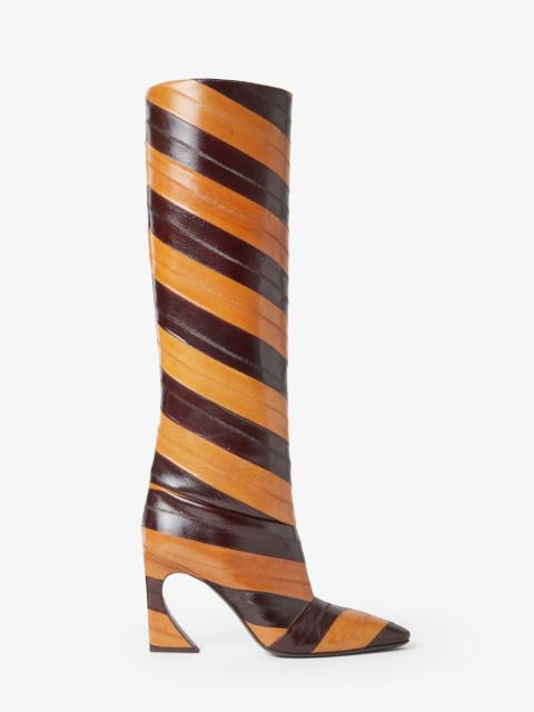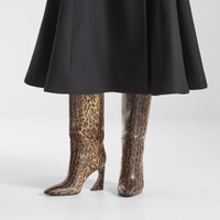 Tubular boots with tapered toe and high heel featuring the iconic Arco line, customized with metal detail and engraved logo. Made of shiny karung leather with brown Fendi Leo animalier print. Covered heel and leather sole. Made in Italy Composition: 100% karung snake leather, inside: 100% calf leather Product Code: 8W8802AY9LF0QB9