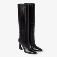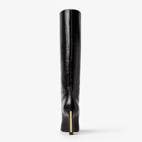 Tubular boots with tapered toe and high heel featuring the iconic Arco line, customized with metal detail and engraved logo. Made of black shiny hagfish leather. Covered heel and leather sole. Made in Italy Composition: 100% hagfish, inside: 100% calf leather Product Code: 8W8802AOSHF0QA1