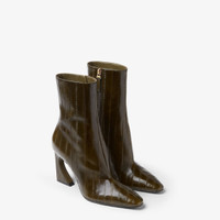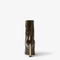 Ankle boot with internal zipper in gold-finish metal. Made of shiny olive green hagfish leather. High heel covered in matching hagfish leather with iconic Arco line. Gold-finish metal detail on the heel, customized with engraved logo. Leather soles. Gold-finish metalware. Made in Italy Composition: 100% hagfish, inside: 100% calf leather Product Code: 8T8776AOSHF0WWE