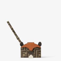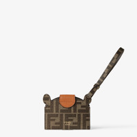 Fendi Best Friends Forever card holder with squirrel-head design. Features an internal compartment and clasp with bridge and hidden snap button. Leather strap to attach it to bags and belts. Made of fabric with iconic FF motif and brown details. Gold-finish metalware. Made in Italy Composition: 100% calf leather, 49% polyurethane, 28% cotton, 23% polyester, back: 100% calf leather Product Code: 8M0523AYIYF1TWY