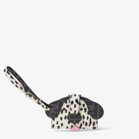 Fendi Best Friends Forever card case with dog-head design. Features an internal compartment and clasp with bridge and hidden snap button. Leather strap to attach it to bags and belts. Made of white full grain leather embellished with a polka dot print and black FF fabric details. Gold-finish metalware. Made in Italy Composition: 100% calfskin, 49% polyurethane, 28% cotton, 23% polyester, inside: 50% polyamide, 50% polyurethane Product Code: 8M0539AW6DF0V3B