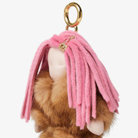 Margot bag charm made of nappa leather with pink mink hair and gold leather clip decorated with FF logo. Brown mink coat. Jersey socks and nappa leather slippers with shearling details decorated with the iconic FF motif in brown. Leather loop with clip and hot-stamped Fendi Roma logo on the back. Gold-finish metalware. Perfect for customizing the look of the collection bags. Made in Italy This product is not a toy and is intended as intended exclusively for adults. Composition: 100% zamak, 100% mink fur, 100% lamb leather, 100% sheep fur, padding: 100% polyester Product Code: 7AS437AYINF0MWU