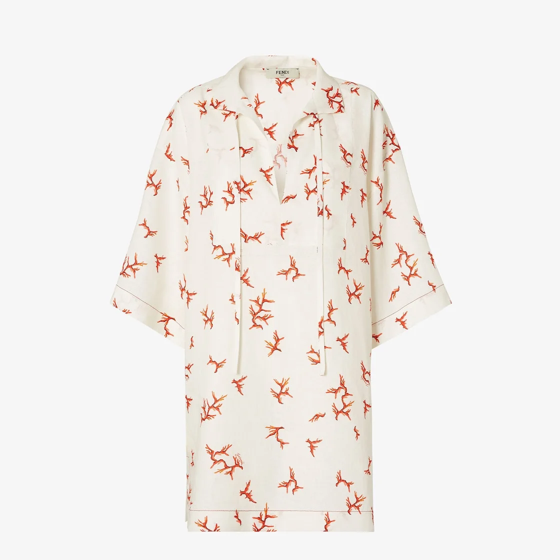 Swimsuit cover-up shirt with drawstring stand collar and open V-neck on the front. Low-set, wide three-quarter sleeves. Side slits. Made of white linen with an all-over coral print in red. Made in Italy Composition: 78% polyamide, 22% elastane Size worn: 38 IT. The model is 180 cm tall Product Code: FXD579AT8MF1MVO