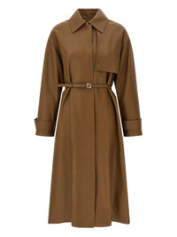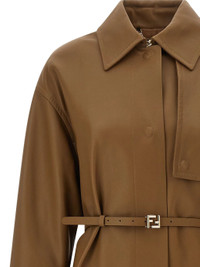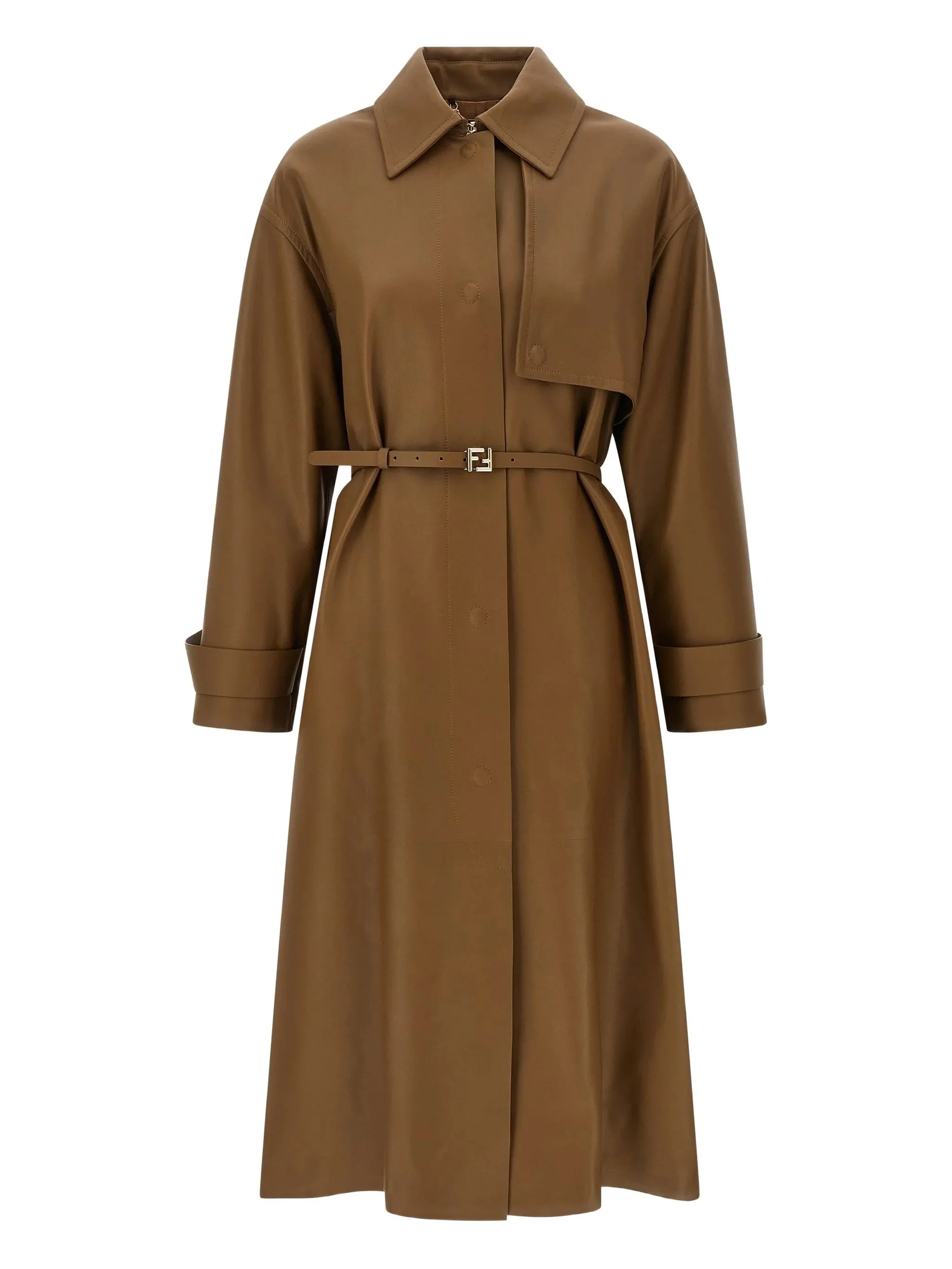 brown lambskin shirt collar snap button closure belt metallic logo buckle back split - Color: BROWN - Made in: Italy - Designer Style ID: AUV3 FPS907 F1T6S Composition and care Lining Composition Viscose: 100.0%, Outer Composition Lambskin: 100.0%