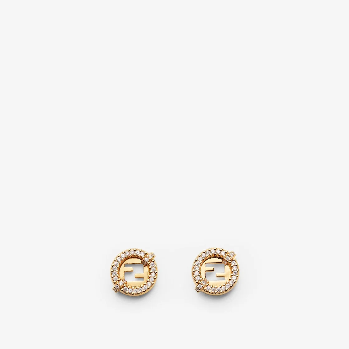 Stud earrings with new Fendi Ever Round logo. Made of metal with a gold finish. Decorated with white crystal bezels on the edge. Made in Italy Composition: 100% bronze, 100% synthetic stone Product Code: 8AL079ATEPF089U Product Care: The product you have purchased may be embellished with a precious metal top or varnish and may also feature appliques, gemstones (in various shades of the same color), crystals, plexiglass or resin. The mixture of materials and the special details give this product its unique character. To best maintain the product’s appearance over time, avoid contact with sea water, spa water, lacquers, perfumes, solvents, chemicals and abrasive materials. If necessary, clean with water and a neutral soap and/or polish with a dry microfiber cloth.