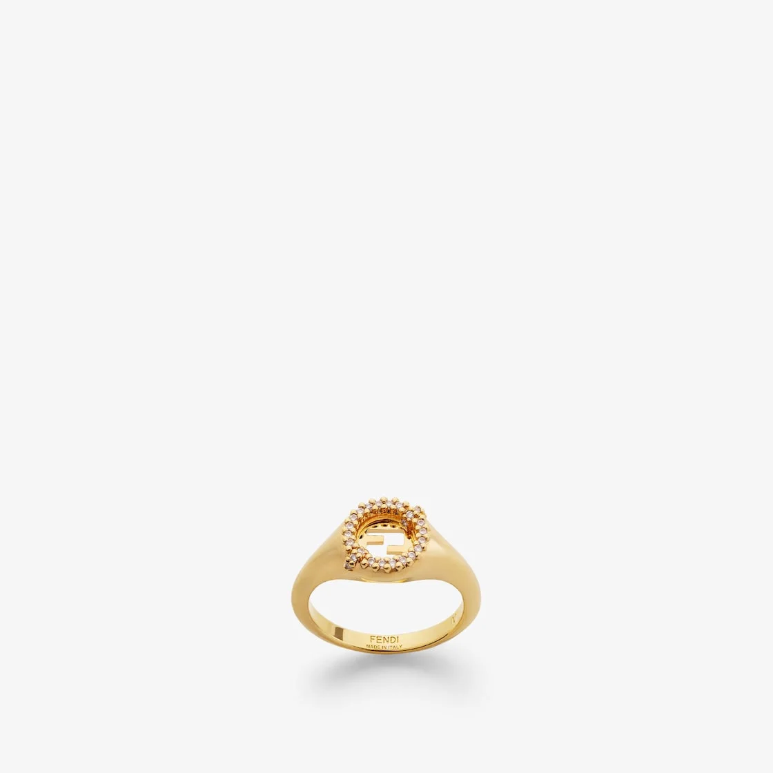 Chevalier ring with new Ever Round Fendi logo. Made of gold-finish metal. Finished with crystal bezels along the edge. Made in Italy Composition: 100% bronze, 100% synthetic stone Product Code: 8AL084ATEPF089U Product Care: The product you have purchased may be embellished with a precious metal top or varnish and may also feature appliques, gemstones (in various shades of the same color), crystals, plexiglass or resin. The mixture of materials and the special details give this product its unique character. To best maintain the product’s appearance over time, avoid contact with sea water, spa water, lacquers, perfumes, solvents, chemicals and abrasive materials. If necessary, clean with water and a neutral soap and/or polish with a dry microfiber cloth.
