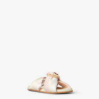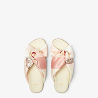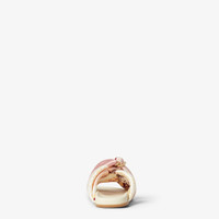 Padded double-band flat slides with decorative D-ring buckle with three-dimensional Fendi lettering. Made of satin printed with the Roman Sunset pattern in light pink and red. Camelia-colored leather lining. Gold-finish metalware. Made in Italy Composition: 97% polyester, 3% elastane, inside: 100% goat leather Product Code: 8X8645AU2WF1SZ4