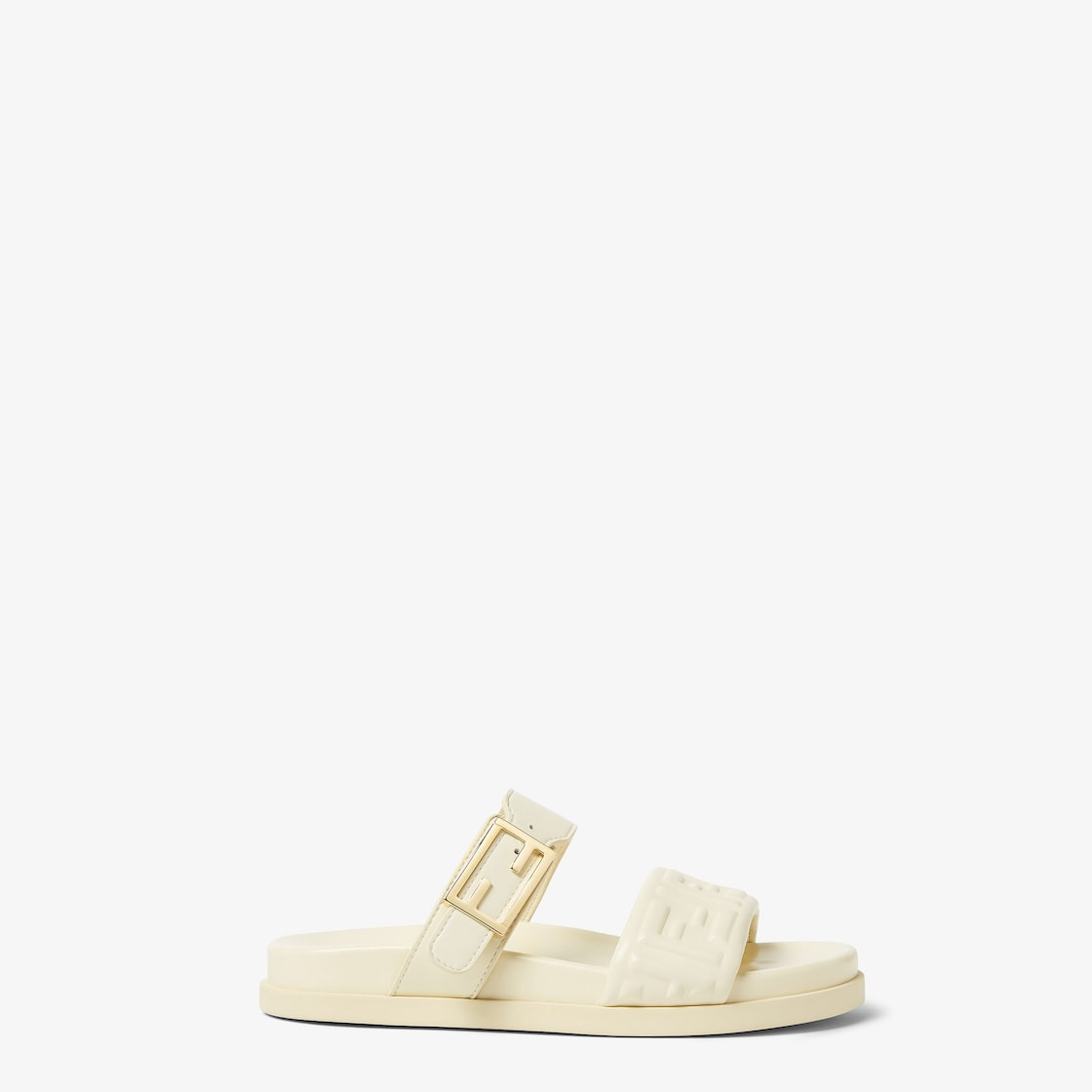 Double-band flat slides with FF Baguette decorative buckle. Made of white nappa leather with embossed FF motif on the front of the band. Gold-finish metalware. Made in Italy Composition: 100% lamb leather, inside: 100% calf leather Product Code: 8X8710ABOHF1SVV