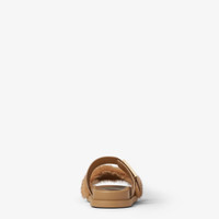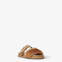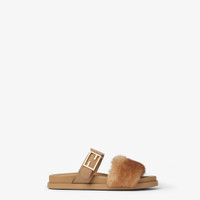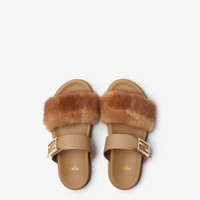 Double-band flat slides with FF Baguette decorative buckle. Made of camel-colored leather with matching mink front band. Gold-finish metalware. Made in Italy Composition: 100% mink fur, 100% calf leather, inside: 100% calf leather Product Code: 8X8710AHGHF1SZ2