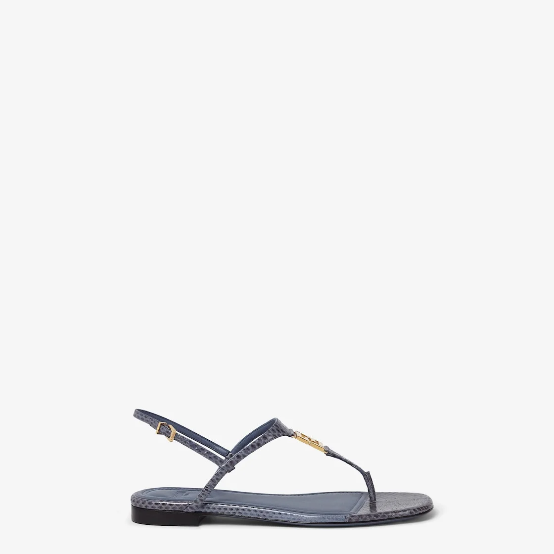 Square toe thong sandals with T-bar and adjustable ankle strap. The metal FF detail, with a special design that includes a functional hinge in the center, makes them comfortable to walk in. Made of blueberry-colored ayers. Leather insole in the same color. Gold-finish metalware. Made in Italy Composition: 100% Ayers leather, inside: 100% goat leather, 100% calf leather Product Code: 8Y8713AUEDF1SJ4