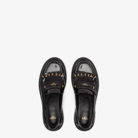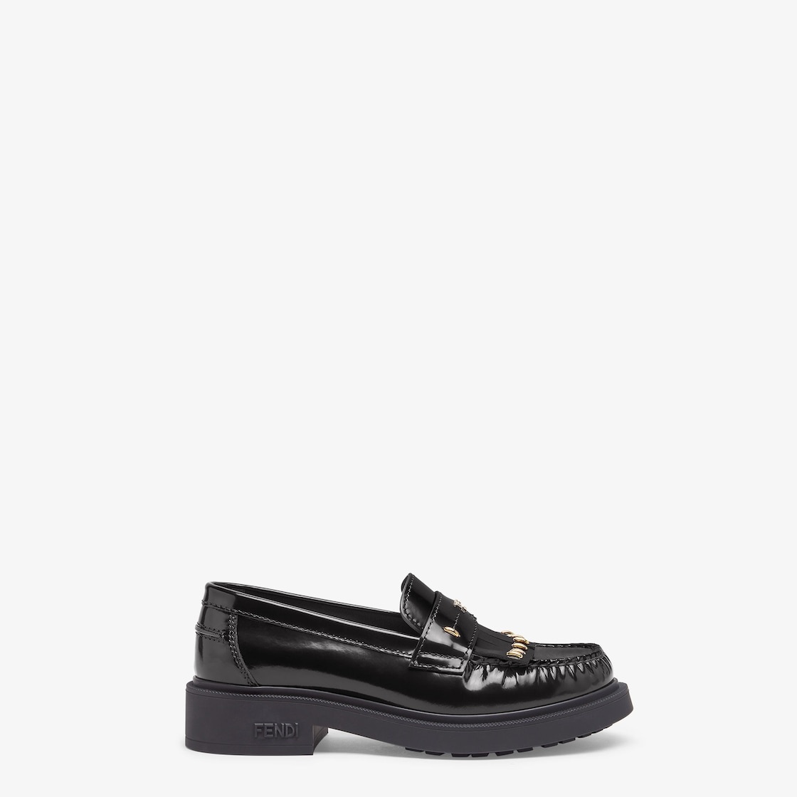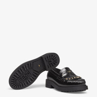 Preppy Fendi Filo loafers with strap and fringe detail. Made of shiny, black leather. Embellished with metal Selleria stitching and metal embossed Fendi Roma lettering. 40 mm (1.6 inch) rubber sole with Fendi logo on the heel. Gold-finish metalware. Made in Italy Composition: 100% calf leather, interior: 100% calf leather Product Code: 8D858269FF0QA1