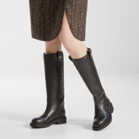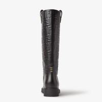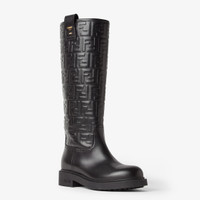 Tubular leg boots with round toe. Made of black leather. Leg with iconic FF motif in heat-stamped relief. Decorated with Selleria metal stitching and Fendi Roma metal lettering. Rubber sole and heel with Fendi lettering on the side. Gold-finish metalware. Made in Italy Composition: 100% calfskin, inside: 100% calfskin Product Code: 8W8574AY9OF0ABB