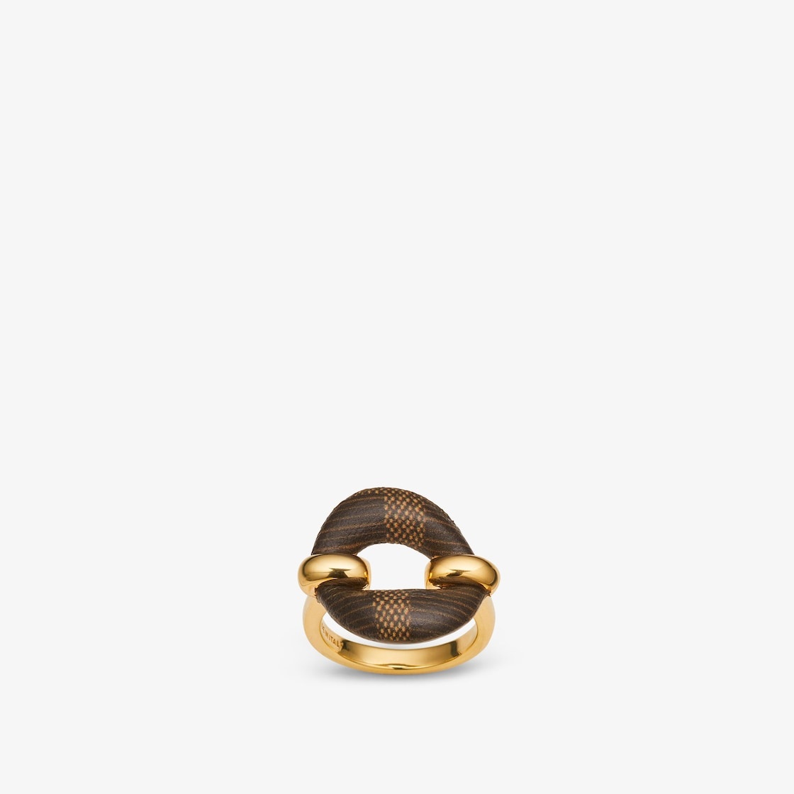 Fine ring made of metal with a gold finish. Irregular circle detail in nappa leather printed with brown trompe-l'oeil effect FF motif. Embellished with two embossed metal stitches. Made in Italy Composition: 100% brass, 100% lambskin Product Code: 8AK770ASLPF0XEC Product Care: The product you have purchased may be embellished with a precious metal top or varnish and may also feature appliques, gemstones (in various shades of the same color), crystals, plexiglass or resin. The mixture of materials and the special details give this product its unique character. To best maintain the product’s appearance over time, avoid contact with sea water, spa water, lacquers, perfumes, solvents, chemicals and abrasive materials. If necessary, clean with water and a neutral soap and/or polish with a dry microfiber cloth.
