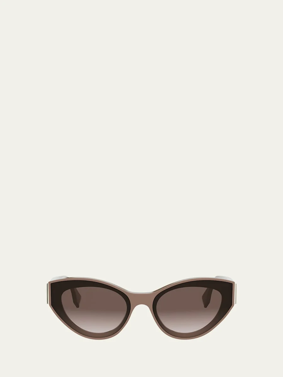 Fendi "Fendi First" sunglasses in acetate, embellished with the line's signature oversized, diagonal metal F motif at the temples Lens/bridge/temple (in mm): 62-15-140 Cat-eye frames Gradient lenses Acetate nose pads Wide, tapered arms 100% UVA/UVB protection Made in Italy Proposition 65 warning for California residents Online Inquiries: BGS21_D5GRA| Store Inquiries: #5404337