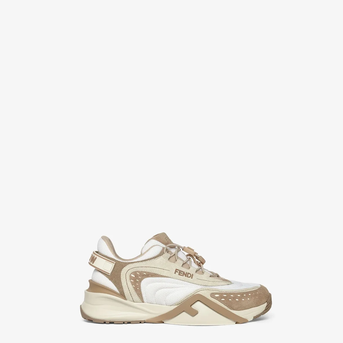 Fendi Flow sneakers with adjustable elastic laces and drawstring fastening. Customized with suede label and embossed FF on the tongue and rubber tab with embossed logo on the back of the heel. Made of white tech mesh with suede inserts in white and beige. Rubber details. 35 mm rubber running sole with beige diagonal F motif. Made in Italy Composition: 100% polyester, 100% calf leather Product Code: 8E8620AOTJF1R93