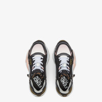 Fendi Flow sneakers with adjustable elastic laces and side zipper closure. Customized with FF pattern on the tongue and rubber tab with embossed logo on the back of the heel. Made of technical fabric in black, light blue and pink gradient colors. Contrasting black leather details and contrasting green trims. 35 mm (1.4 inch) white rubber running shoe sole with pink diagonal F detail. Made in Italy Composition: 100% polyurethane, 100% polyester, inside: 100% recycled polyester Product Code: 8E8570AOSEF1PZ1