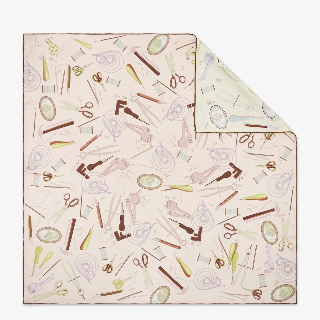 Square foulard made of silk twill. The graphics celebrate the craftsmanship of Fendi artisans, depicting all the essential tools for the creation of the Selleria products. The double-face print is created in a combination of colors, with one side in mauve pink and the other in light green. Hand-rolled hems. Made in Italy Composition: 100% silk Product Code: FXT091ATZPF1QW1