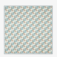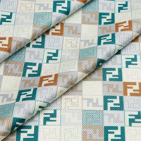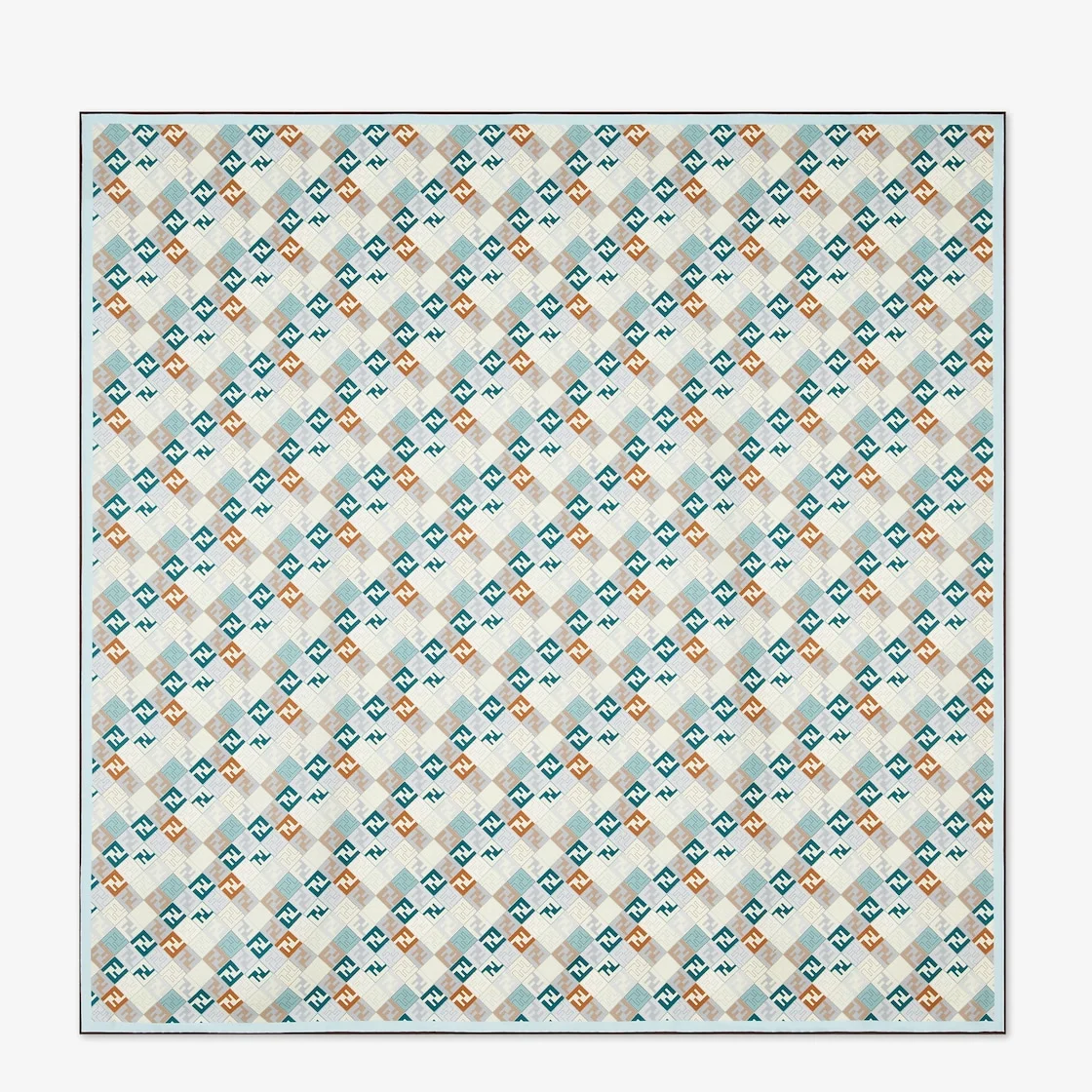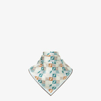 Square foulard made of organic silk twill. Customized with a pattern of geometric shapes and micro FF logos in colors such as light blue, gray and brown, creating a dynamic visual effect. Framed by color-block stripes. Hand-rolled hems. Made in Italy Composition: 100% silk Product Code: FXT091AUMDF1WO9