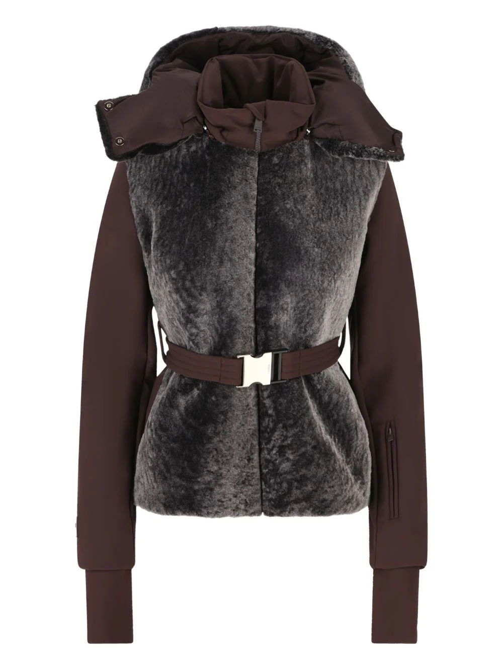 shearling padded jacket Highlights - Brown - Shearling panel - Belt loops - Belt fastening - Zip fastening - Long sleeves Made in Italy Composition Outer: Polyamide 75%, Spandex/Elastane 25% Lining: Sheep Skin/Shearling 100%, Duck Down 90%, Duck Feathers 10%