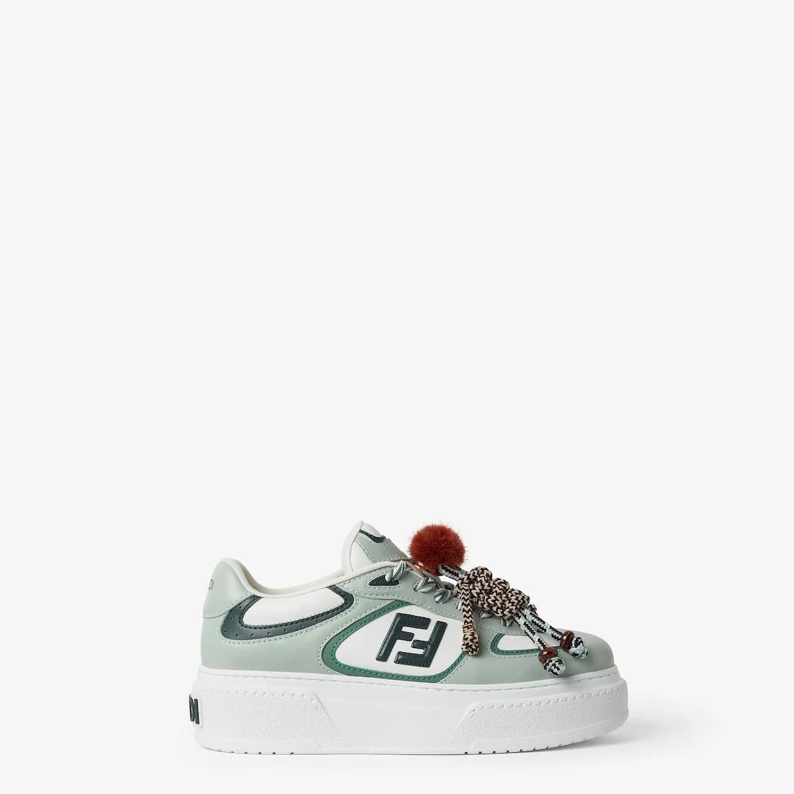 Fendi Match lace-up sneakers. Made of light green leather with green details. FF applique on the sides in contrasting leather and hiking laces in white and green. Rubber platform sole with oversized, embossed Fendi lettering at the back. Finished with charms attached by a metal ring on the tongue: on the right shoe is a little doll in braided cord with contrasting mink details and gold-colored metal FF bracelets. On the left shoe is a braided cord scoubidou with contrasting mink double pompom, completed by a metal FF bead, and tag with printed Pequin motif and logo. Made in Italy Composition: 100% calf leather, 100% mink fur, inside: 100% calf leather Product Code: 8E8721AY9NF1TO5