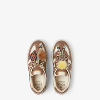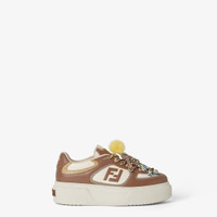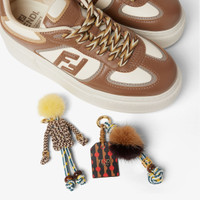 Fendi Match lace-up sneakers. Made of brown leather with beige and white details. FF applique on the sides in contrasting leather and hiking laces in white, beige and brown. Rubber platform sole with oversized, embossed Fendi lettering at the back. Finished with charms attached by a metal ring on the tongue: on the right shoe is a little doll in braided cord with contrasting mink details and gold-colored metal FF bracelets. On the left shoe is a braided cord scoubidou with contrasting mink double pompom, completed by a metal FF bead, and tag with printed Pequin motif and logo. Made in Italy Composition: 100% calf leather, 100% mink fur, inside: 100% calf leather Product Code: 8E8721AY9NF1TO6