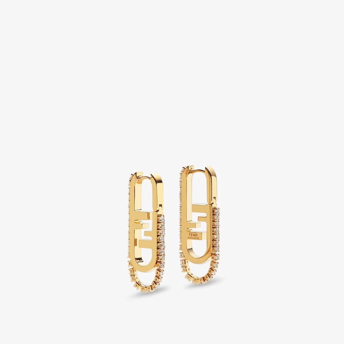Tennis earrings with Fendi O’Lock motif. Made of metal with a gold finish. Embellished with inset natural crystals. Made in Italy Composition: 100% bronze, 100% synthetic stone Product Code: 8AL173ATEPF089U Product Care: The product you have purchased may be embellished with a precious metal top or varnish and may also feature appliques, gemstones (in various shades of the same color), crystals, plexiglass or resin. The mixture of materials and the special details give this product its unique character. To best maintain the product’s appearance over time, avoid contact with sea water, spa water, lacquers, perfumes, solvents, chemicals and abrasive materials. If necessary, clean with water and a neutral soap and/or polish with a dry microfiber cloth.