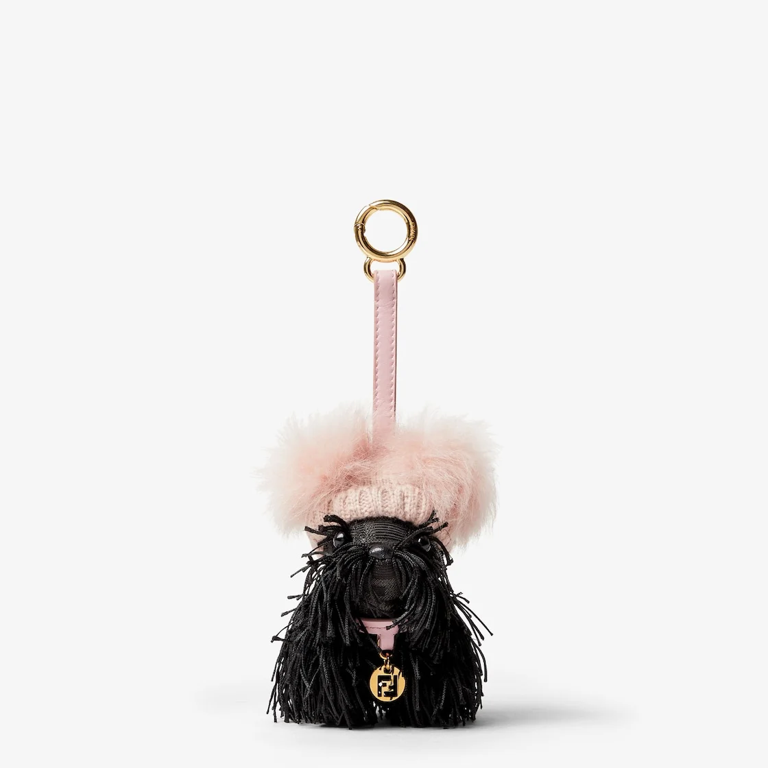 Bag charm made of black FF jacquard fabric and pink shearling. The dog-shaped charm, with a brown leather strap and Fendi logo clip, is inspired by Creative Director Silvia Venturini Fendi’s dog ITO. Embellished with tone-on-tone leather braids, knit beanie with pink shearling double pom-pom and pink leather collar. Gold-finish metalware. A playful and personal accessory to elegantly enrich every bag in the collection. Made in Italy Composition: 100% brass, 100% lamb fur, 100% polyester, 100% polyamide, 100% calfskin Product Code: 7AS462AW6CF0MWU