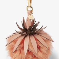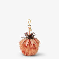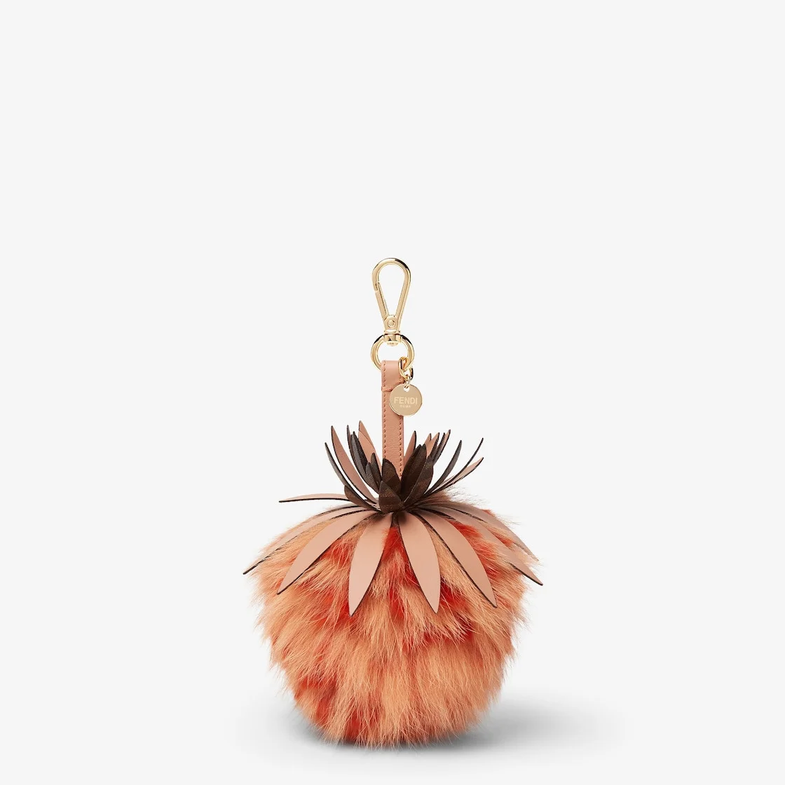 Fendi Pineapple charm with leather strap, clip and customized Fendi logo nameplate. Made of orange fox and rabbit fur. Gold-finish metalware. Ideal as an accessory for bags and key rings. Made in Italy Composition: 100% fox fur, 100% rabbit fur, 100% calf leather Product Code: 7AR577AURDF1SYT