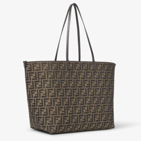 Large shopper bag, created in 1997 together with the Baguette and designed to partner it. A functional, timeless carry-all, it is the perfect combination of practicality and refined details. With a reversible design, it is made of jacquard with a brown Pequin striped motif on one side and the iconic FF jacquard in tobacco brown on the other. It has a removable internal zipper pocket in tone-on-tone leather and gold-finish metal accessories. It can be carried by hand or on the shoulder thanks to the brown calfskin handles finished with hand-sewn macro topstitching, an emblem of the iconic Selleria stitching handed down through generations of Fendi artisans since 1925. Made in Italy. Made in Italy Composition: 63% polyester, 31% cotton, 6% polyurethane, 100% calf leather, inside: 65% polyester, 35% cotton Product Code: 8BH425AYDBF1GL7